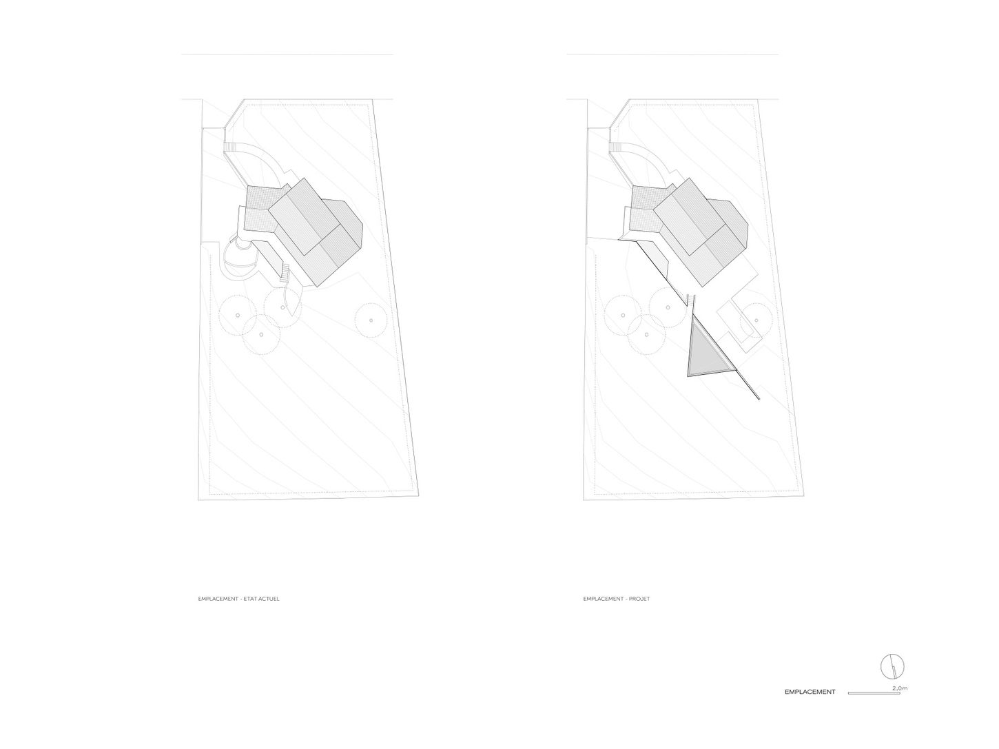 Dans les pentes du Livradois, face à la chaîne des Puys, ce projet d’extension d’un pavillon est un projet de soutènement. Un soutènement qui se détache de l’existant et permet de réouvrir la maison sur sa face Sud, en lui offrant un prolongement extérieur de plain-pied qui accueille terrasse et piscine, en continuité des espaces jusqu’alors exclusivement orientés à l’Ouest, face au panorama. L’atelier s’intègre dans le prolongement du mur existant, qui accueille la réserve de bois et l’escalier qui relie la maison au jardin bas. La pointe du triangle cadre la vue entre les maisons situées en contrebas, recherchant le rapport privilégié au paysage, qui existait quand seuls les prés bordaient la parcelle. La toiture fonctionne comme un petit bassin de rétention, souligné par un long puits de lumière qui éclaire la table de travail.