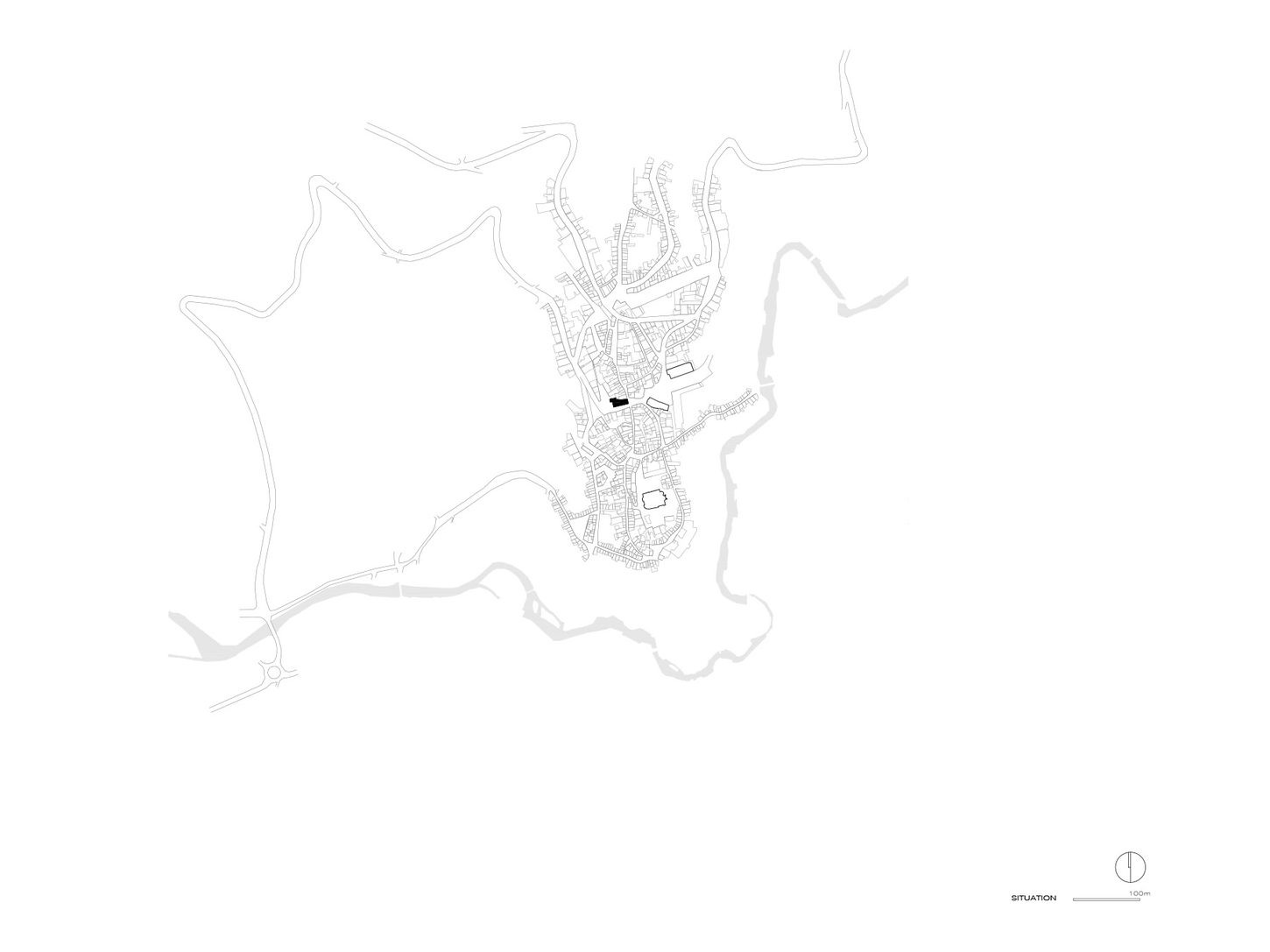 Situé à la rencontre de deux axes majeurs de la ville haute de Thiers, cet ”îlot-bâtiment”, constitué d’une complexe imbrication de trois édifices, profite d’une position remarquable, à la fois centrale et ouverte sur le chaîne des Puys. Le projet propose un équilibre entre préservation de l’héritage construit, et recherche d’une continuité à travers le nouveau socle commercial et sa rue intérieure véritable trait d’union entre centre-ville et panorama. Les dofférents programmes qui réinvestiront les lieux (centre de formation, co-working, brasserie, bistrot, halles marchandes) s’articulent autour d’un unique hall invitant au partage des usages. La reconstruction de la ro-tonde s’inscrit dans le prolongement du socle, privilégiant une structure ouverte dont la géométrie accompagne le dessin en cours de l’espace public.